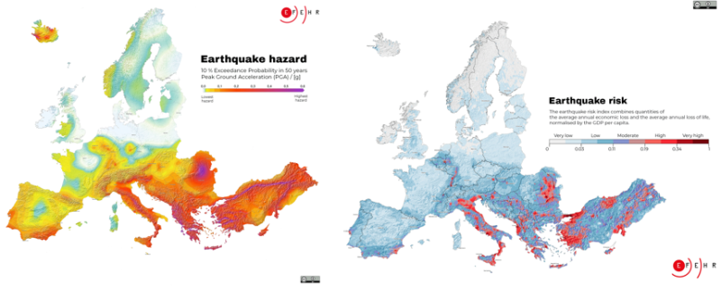 [11] La carte de risque représente une estimation des conséquences économiques et humaines probables auxquelles on peut s’attendre du fait des séismes, dans les différentes régions européennes. Celui-ci est déterminé par l’aléa sismiques, les conditions locales des sols, l’exposition (densité et répartition des bâtiments et des populations) et la vulnérabilité (état des bâtiments, etc.).