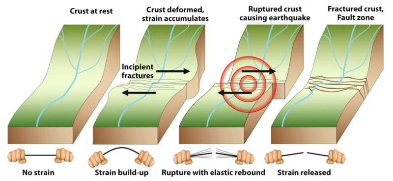 La partie de la croûte terrestre qui a rompu est déjà connue pour accumuler de fortes contraintes depuis plusieurs centaines d’années, du fait des mouvements continuels de la tectonique des plaques à grande échelle. En d’autres termes, les plaques tectoniques se déplacent de manière plutôt stable dans la croûte terrestre et se déforment élastiquement. Leurs mouvements, créés par les forces de contraintes et de déformation, s’accumulent au cours du temps jusqu’à un point de rupture (ou seuil de contrainte) à partir duquel la faille se fracture puis les ondes sismiques se propagent. Lors d’un séisme, les contraintes accumulées se relâchent puis déforment et « cassent » la faille. Ensuite, un nouveau cycle de chargement recommence qui mènera à l’occurrence d’un nouveau séisme dans le futur.