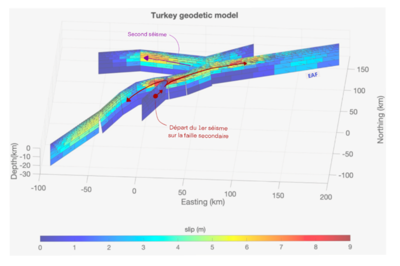Un autre élément, moins important pour les conséquences du séisme, mais intéressant scientifiquement, est que la rupture ne s’est pas initiée sur la faille principale (EAF) mais sur une faille secondaire (cf. figure E). La rupture de celle-ci s’est ensuite transmise et propagée à la faille principale (EAF), la rompant sur un total de 300 km, en partie vers le sud-ouest (côté gauche figure E) et en partie vers le nord-est (côté droit figure E). L’ensemble de rupture sur les différents tronçons de faille s’est produite entre la surface et 20 km de profondeur, et le mouvement de bloc le long de la faille a pu atteindre localement 8 à 9 mètres (Figure E). La longueur de rupture, l’ampleur du mouvement sur la faille, et la profondeur plutôt superficielle de la rupture expliquent en grande partie les intensités ressenties et l’ampleur des dégâts associés. Cependant, des questions se posent toujours : pourquoi la rupture ne s’est-elle pas arrêtée en bout de faille secondaire comme on aurait pu l’imaginer ? Pourquoi s’est-elle transmise à la faille principale ? Comment expliquer qu’un second choc de magnitude 7,5 se soit produit seulement 9 heures après ?