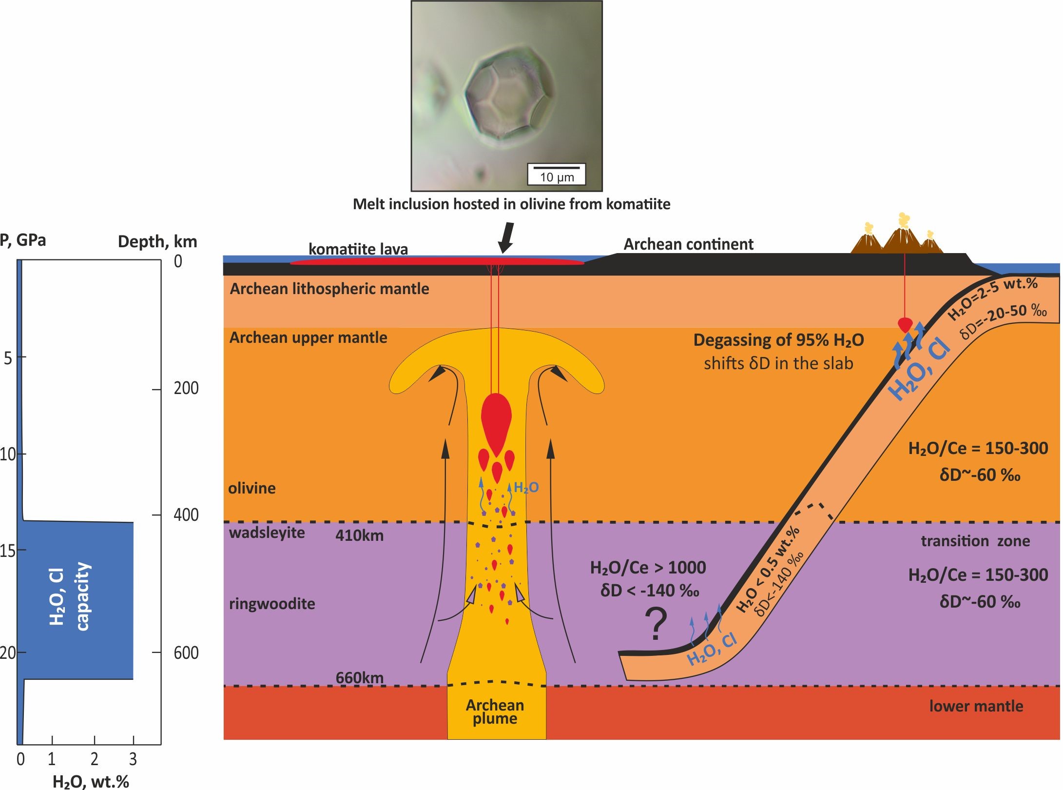 En 2016, un groupe international dirigé par des scientifiques d’ISTerre a étudié les inclusions vitreuses d’olivine de komatiites de la ceinture de l’Abitibi au Canada, datées à 2,7 milliards d’années (Sobolev et al., Nature 2016). Ils ont obtenu les premières analyses des concentrations d’eau et d’éléments mobiles dans les fluides aqueux (Rb, Ba, Cl, Pb, Sr) dans les magmas komatiitiques et ont utilisé ces résultats comme preuve d’une teneur élevée en eau et en chlore dans les couches profondes du manteau pendant le Néoarchéen (de -2,8 à -2,5 milliards d’années) Ils ont ainsi proposé l’existence d’un réservoir profond dans le manteau contenant quelques milliers de parties par million d’eau dans des polymorphes haute pression de l’olivine. Cette eau peut s’être accumulée lors de l’accrétion primordiale de la Terre ou avoir été introduite dans le manteau lors de la subduction précoce d’une croûte altérée par l’eau de mer, qui est ensuite restée piégée dans la zone de transition.