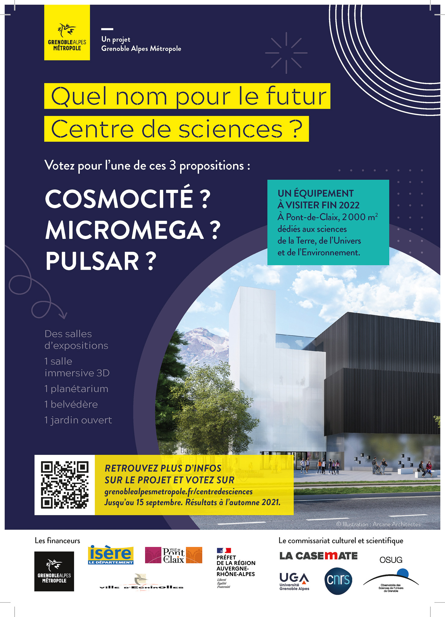 ► En ligne à l’adresse : grenoblealpesmetropole.fr/centredesciences ou en déposant un bulletin de vote dans une urne présente dans le hall d’accueil de la Métropole, située 3 rue Malakoff à Grenoble. Le nom retenu sera communiqué à l’automne 2021.