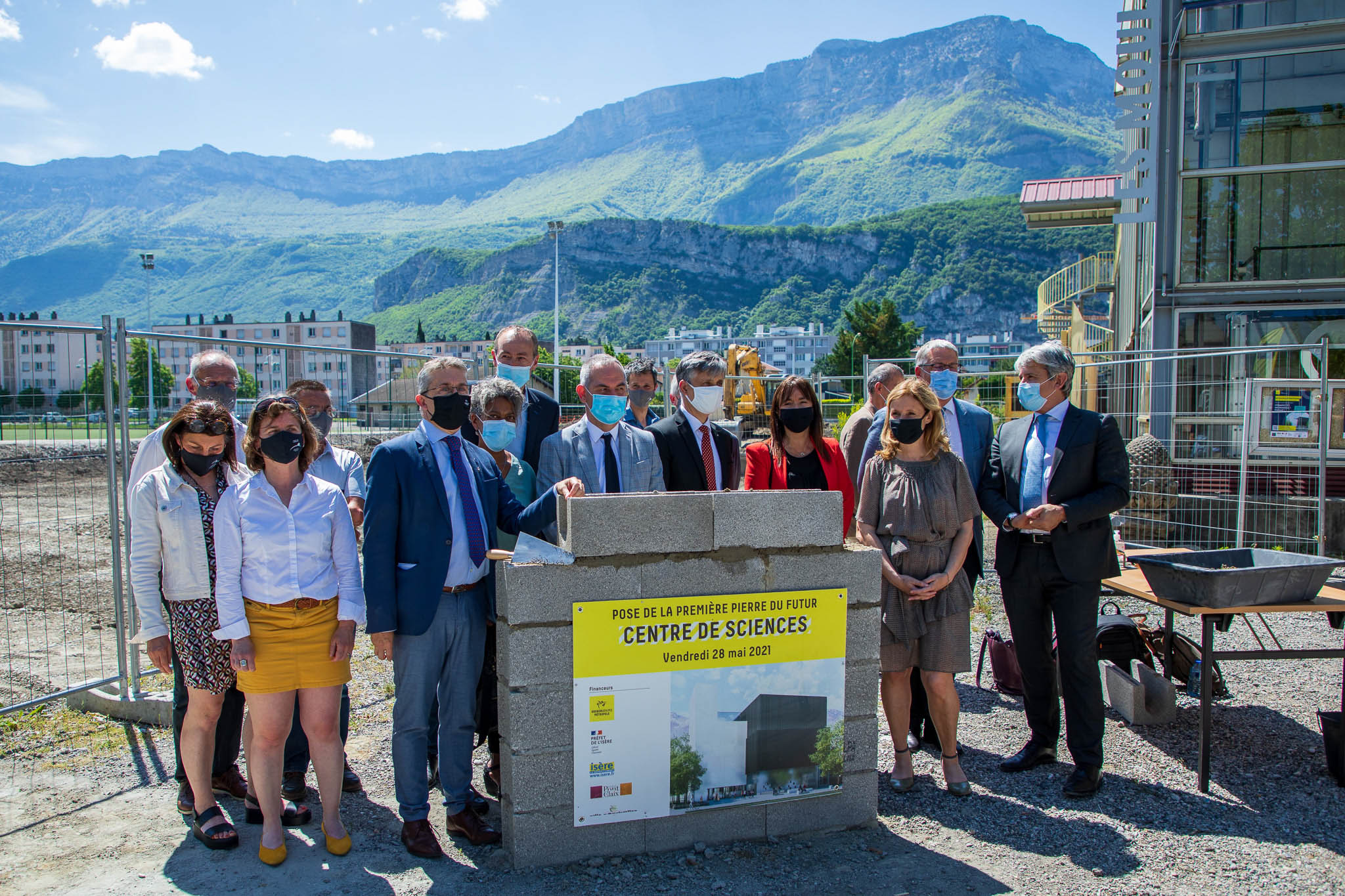 Pose de la première pierre du Centre de sciences le vendredi 28 mai en présence de tous les partenaires du projet (Grenoble-Alpes Métropole, Présidence de l’EPCC, Mairie d’Echirolles, Mairie de Pont-de-Claix, Département de l’Isère, Région Auvergne-Rhône-Alpes, Préfecture de l’Isère, Université Grenoble Alpes et CNRS)