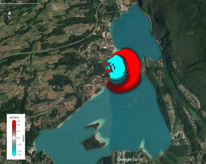 Les chercheurs ont utilisé des modèles numériques pour simuler le mouvement de masse en utilisant le modèle rhéologique visco-plastique de Herschel-Bulkley et pour modéliser la vague de tsunami correspondante avec des modèles dispersifs et non-dispersifs « of shallow water type« . Les résultats montrent que les effets de dispersion sont négligeables dans le cas de glissements de sédiments subaquatiques dans un lac relativement petit. En reconstituant un événement de paléotsunami inédit en milieu lacustre, ce travail de recherche améliore la compréhension des risques géologiques historiques et futurs, en particulier dans des zones à activité sismique.