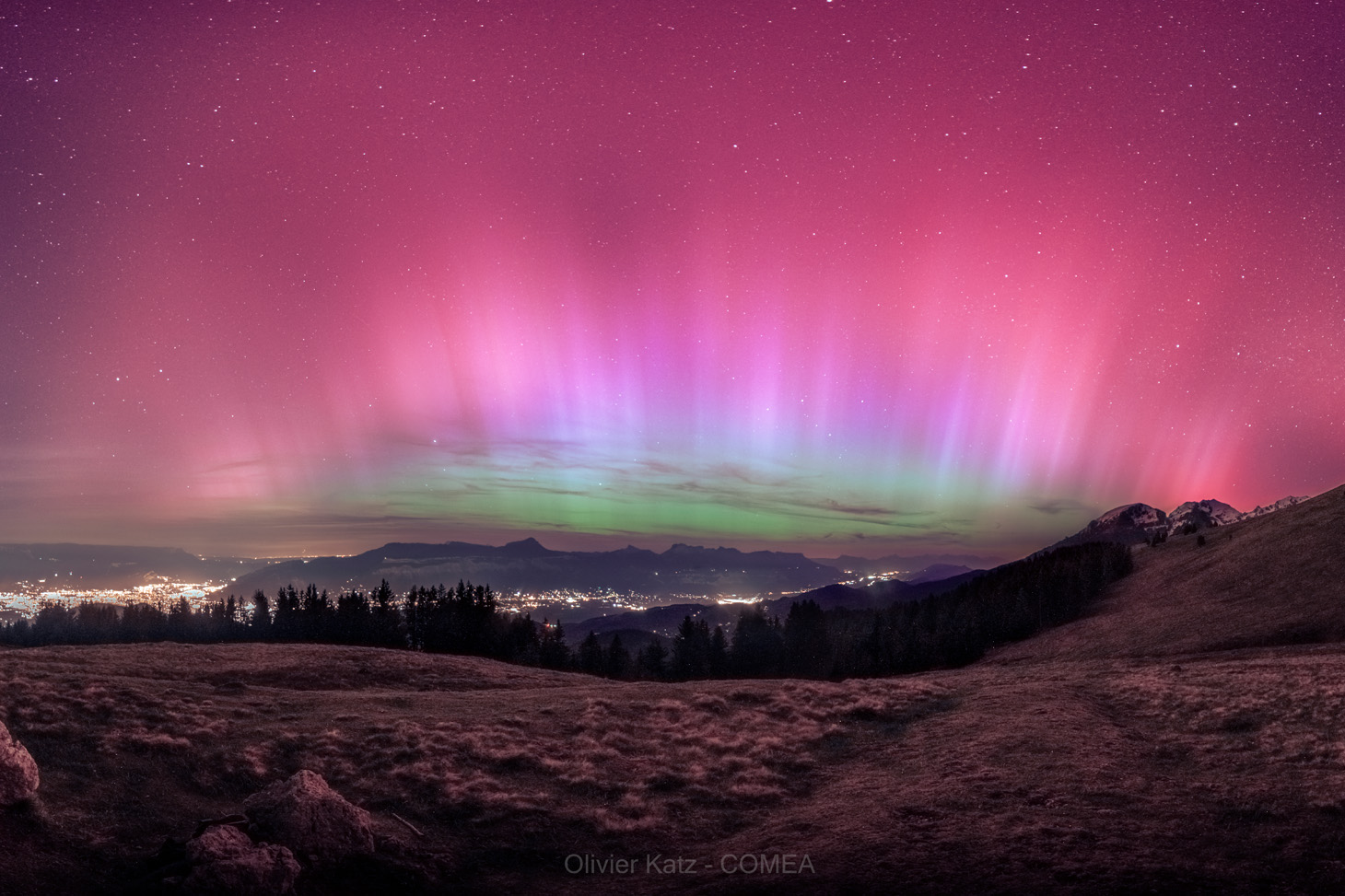 Depuis la France aussi le spectacle a été d’une intensité folle. En regardant au nord, il était possible d’observer ces voiles de lumière en train de danser de l’autre côté de la manche. Formés de 80 à 400km d’altitude et à plusieurs centaines de kilomètres de chez nous, nous pouvions donc en observer la tranche. Au plus haut, des rideaux rouges et bleutés se formaient, tandis qu’un arc vert se tenait à la base de ces piliers. Suite à cela dans le week-end, les 3 autres vagues envoyées par notre Soleil sont arrivées les unes après les autres, sans atteindre le niveau d’intensité de la veille.
