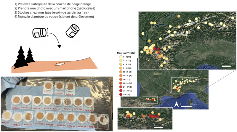 Le 6 février 2021, les cimes enneigées des Pyrénées et des Alpes se sont réveillées colorées d’une fine couche de poussières orange venant du Sahara. Pour caractériser cet épisode qui s’est rapidement avéré remarquable par son intensité et son étendue, les scientifiques ont décidé de lancer une campagne de science participative impromptue visant à collecter rapidement un maximum d’échantillons de « neige orange ». Cette campagne a été relayée sur les réseaux sociaux et a permis de récupérer 152 échantillons collectés des Pyrénées aux Alpes suisses. Ces échantillons ont ensuite été soigneusement analysés par différents laboratoires français. Les résultats de ces analyses révèlent que la masse déposée était en moyenne 10 g/m2 avec une forte variabilité, certains échantillons approchant 60 g/m2. Les données indiquent que les dépôts sont plus élevés sur les versants exposés au sud, ce qui est confirmé par des observations satellitaires. Les données montrent aussi une décroissance dans la quantité de dépôt au fur et à mesure que l’on s’éloigne de la source. Ainsi, les dépôts les plus importants sont dans les Pyrénées où la moyenne est proche de 20 g/m2. Ces mesures impliquent que des centaines de milliers de tonnes de poussières sahariennes ont été déposées des Alpes aux Pyrénées lors de cet épisode ! Les mesures montrent aussi que la taille des particules décroit avec la distance à la source. Autre découverte, les analyses géochimiques montrent que les particules sont plus riches en fer à proximité de la source, ce qui implique une variation de leurs propriétés optiques.