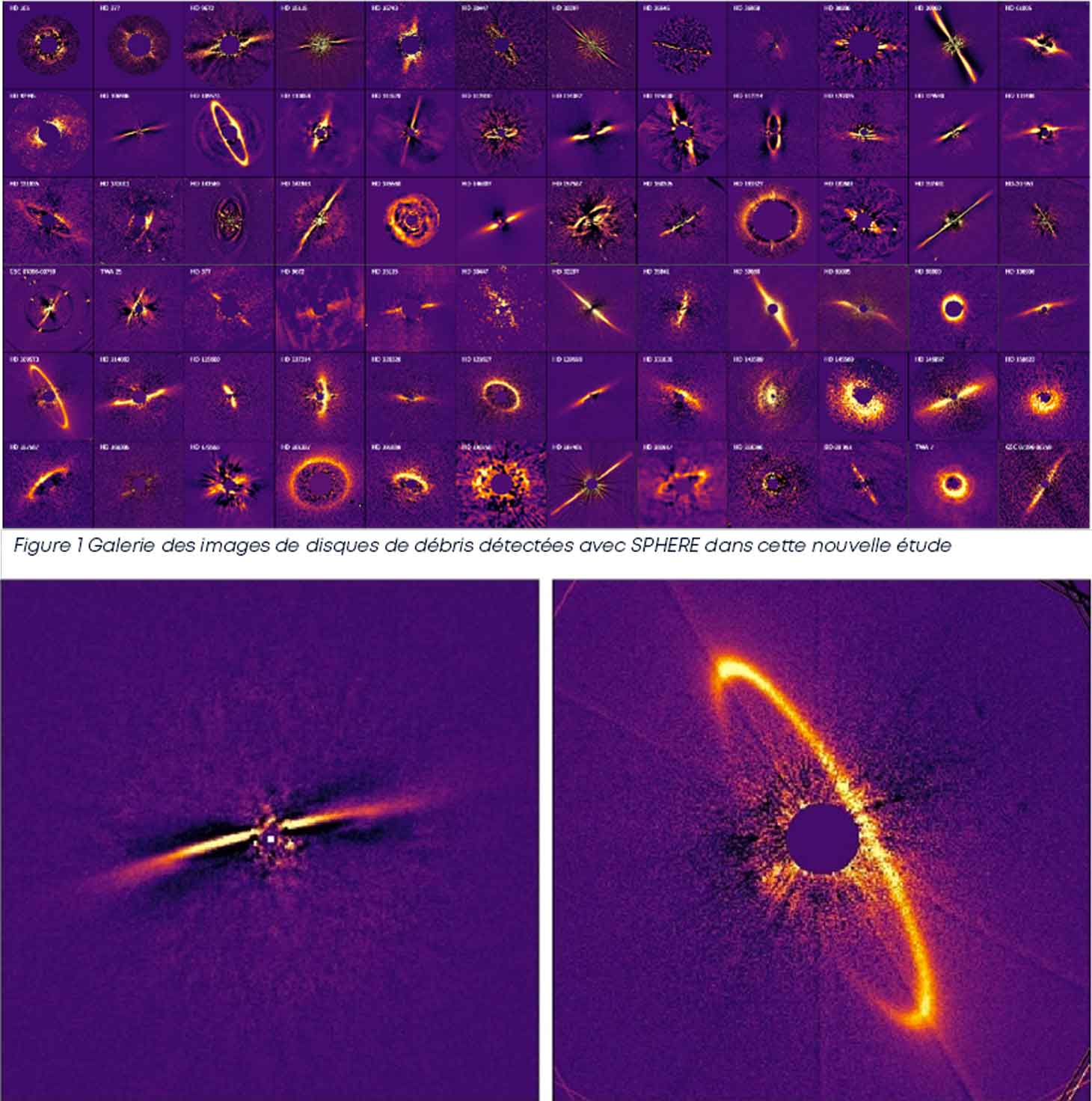 L’étude a révélé des images détaillées de 51 disques de débris, dont quatre ont été photographiés pour la première fois (Figure 1). Ces images révèlent la poussière fine contenue dans ces disques, car les petites particules de poussière sont très nombreuses dans ces disques. Elles sont produites lors des collisions entre les corps plus gros, les astéroïdes et comètes, et diffusent ainsi efficacement la lumière de leur étoile. Ces poussières se distribuent sous forme d’anneaux autour de l’étoile, et selon l’angle de vue depuis la Terre, les anneaux peuvent être observés de dessus ou de côté, donnant ainsi différentes géométries comme le révèle la Figure 1.