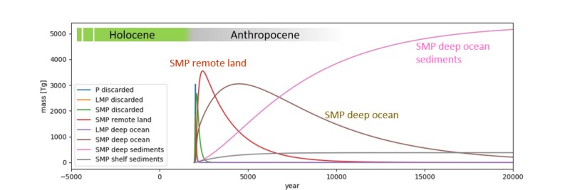 Un important travail de synthèse a été fait pour estimer les quantités de plastiques présents dans l’océan profond, dans les sédiments marins, sur les plages et sur les surfaces continentales. D’autres études récentes ont chiffré les flux d’émission et de dépôts atmosphériques, les taux de sédimentation océaniques et la vitesse de dégradation des plastiques en microplastiques. L’ensemble de ces estimations a permis la conceptualisation du cycle de vie des plastiques (Figure 1) pour l’année de référence 2015. On observe l’importante quantité de plastiques rejetés sur les continents (5000 Tg) par rapport aux plastiques flottant à la surface des océans (0.3 Tg). On note également que la dispersion des plastiques via les rivières (13 Tg/an) est plus importante que la dispersion par émission terrestre (0.2 Tg/an). L’équipe a ensuite formulé un modèle mathématique du cycle de vie des plastiques, afin de simuler la progression de leur dispersion dans l’environnement, depuis 1950, vers l’air, les océans et les sols. Ce modèle montre que, même si on réduit drastiquement la production des plastiques dans les décennies à venir, les microplastiques risquent de circuler pendant des millénaires dans nos écosystèmes (Figure 2). En simulant des scenarios de remédiation, l’étude préconise une gestion plus durable des déchets anciens et nouveaux dans les milieux urbains, industriels et agricoles, afin de limiter la future dispersion des microplastiques.