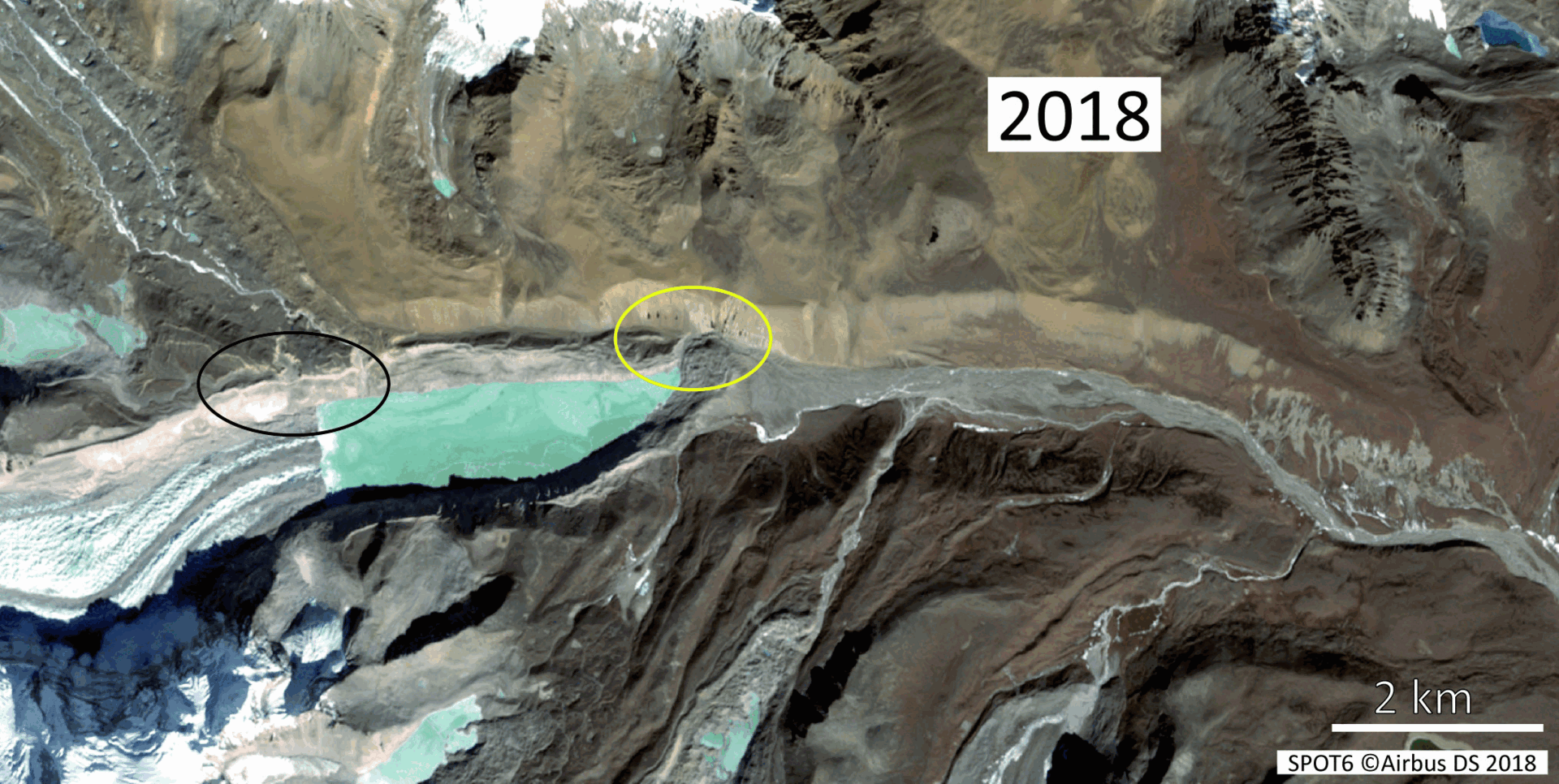 Image satellite avant/après le débordement du lac de South Lhonak Lake. L’effondrement morainique qui a déclenché l’inondation est entouré en noir, et l’érosion du barrage du lac est entourée en jaune.
