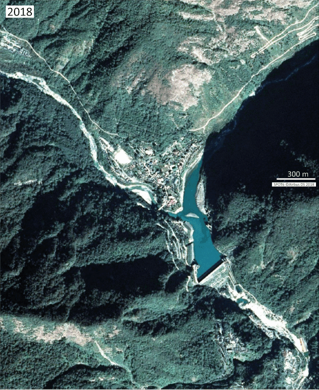 images satellites avant / après du village de Chungthang, Sikkim et du barrage hydroélectrique Teesta III, montrant la destruction de la centrale et les dégâts subis par le village