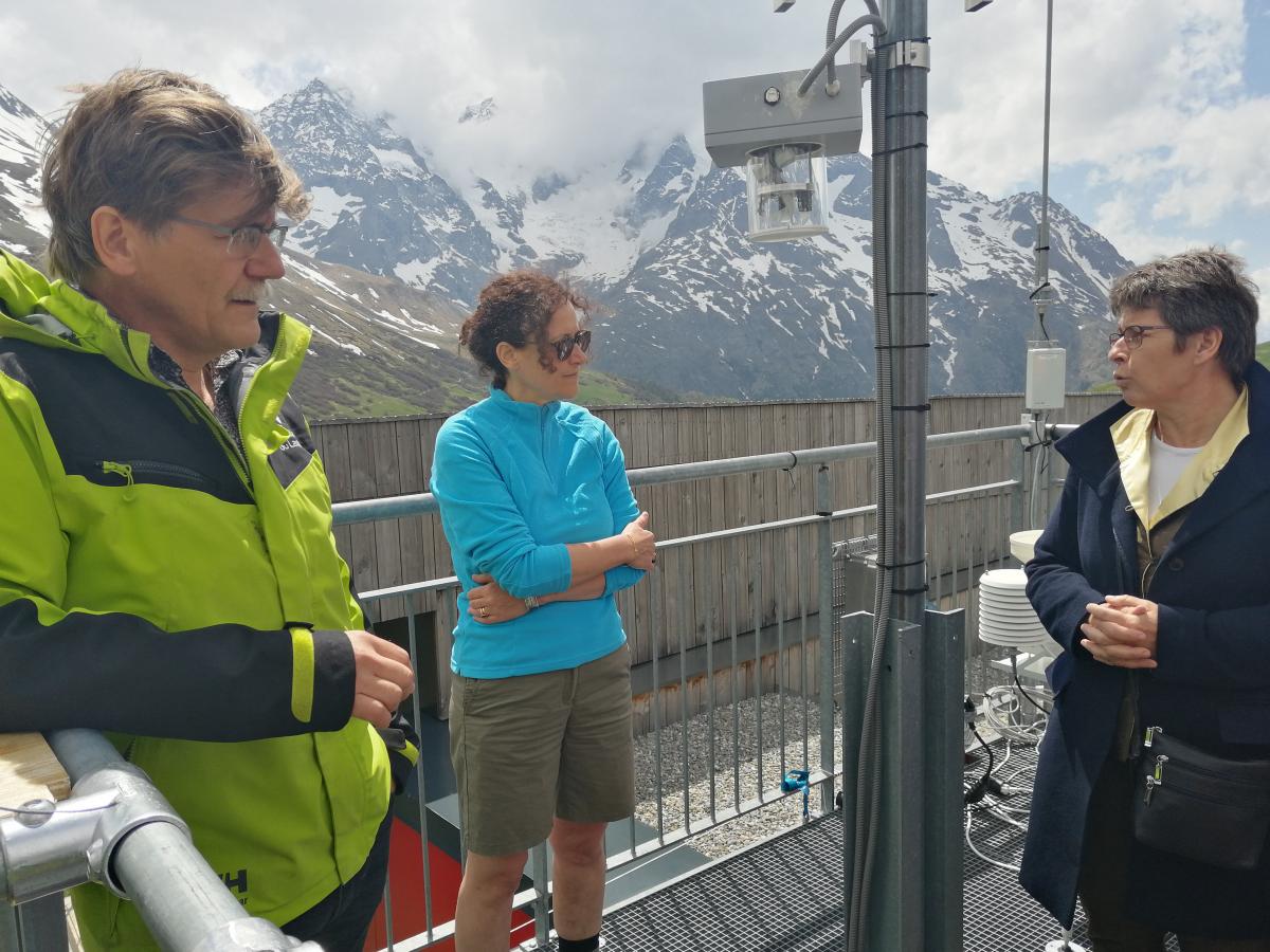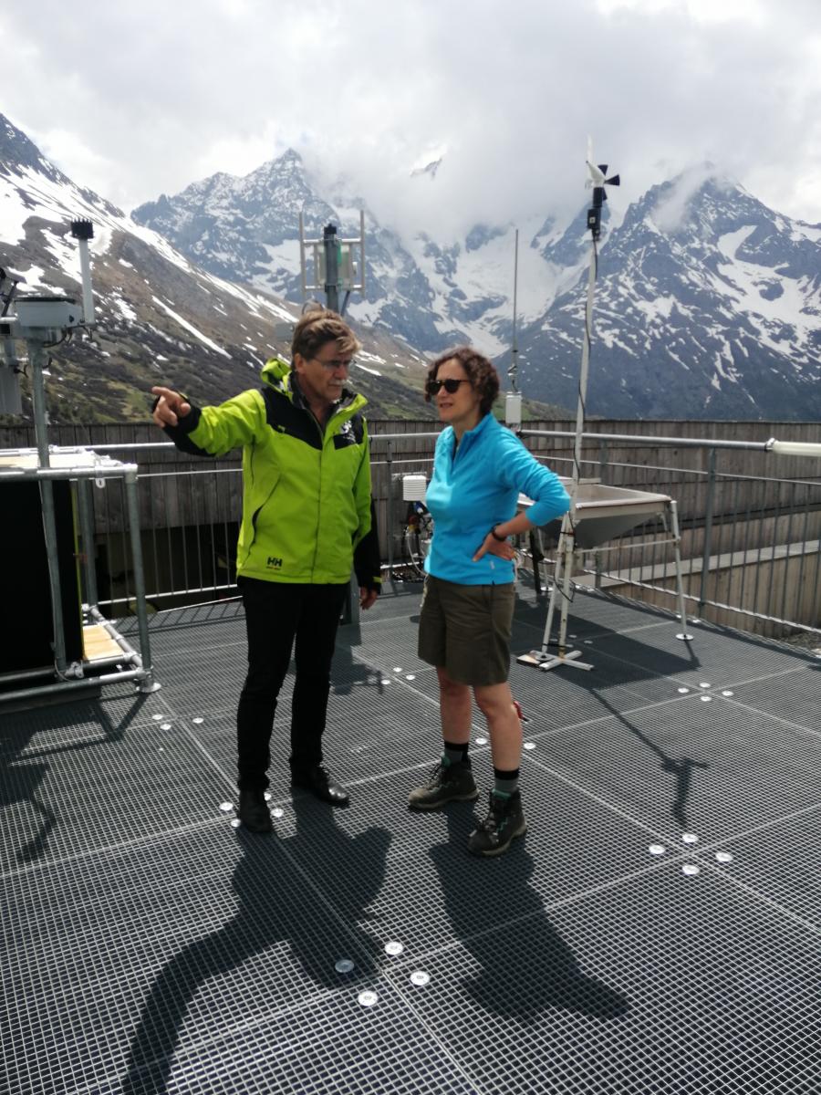 Jean-Gabriel Valay, directeur du Jardin, station de recherche découverte et sciences, sur le toit de la galerie de l’Alpe avec Emmanuelle Wargon. Les dispositfs du laboratoires Edytem (Chambéry), du laboratoire d’écologie alpine (LECA / OSUG), du Parc national des Ecrins et du WSL (Suisse) visibles sur cette photo ont été présentés par Didier Voisin, professeur à l’Université Grenoble Alpes, institut des géosciences de l’environnement.