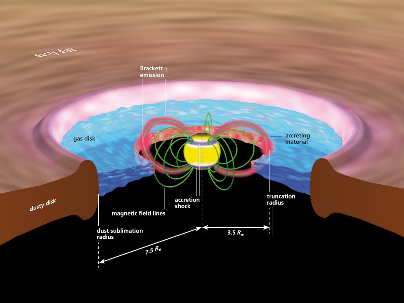 This is a significant difference. According to all physics-based models, the inner rim of a circumstellar disk cannot possibly be that close to the star. If the light originates from that region, it cannot be emitted from any section of the disk. At that distance, the light also cannot be due to a stellar wind blown away by the young stellar object – the only other realistic possibility. Taken together, what is left as a plausible explanation is the magnetospheric accretion model.