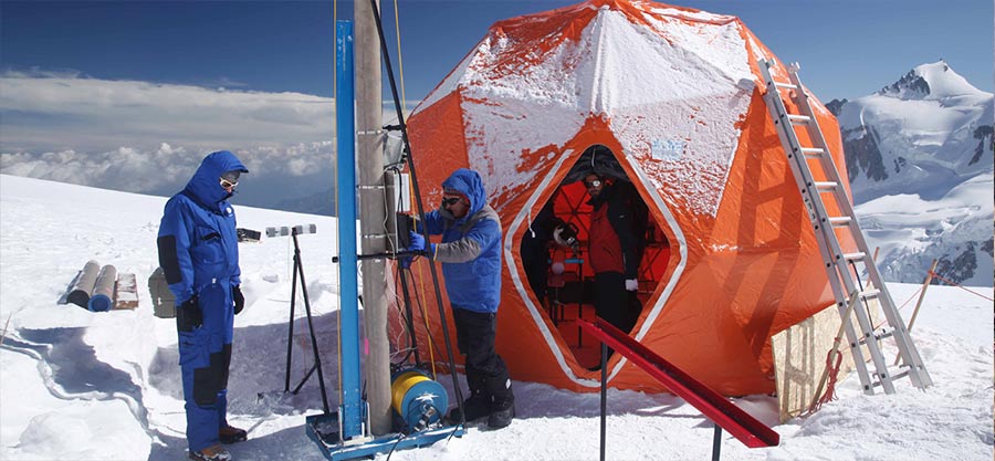 Coordinated by Patrick Ginot, a research engineer at the French Research Institute for Development (IRD) working within the UGA-CNRS formerly named Laboratory of Glaciology and Environmental Geophysics and now Institut des Géosciences de l’Environnement / OSUG (LGGE now IGE - UGA/CNRS/IRD, Grenoble INP), and Jérôme Chappellaz, Director of Research at the National Centre for Scientific Research (CNRS) and working within the same laboratory, an international team of glaciologists and engineers – from France, Italy, Russia and the US – extracted the first three “ice heritage cores” from the Col du Dôme (4,300 metres, Mont-Blanc massif). The goal is to build the world’s first library of ice archives extracted from glaciers which are threatened by global warming.
