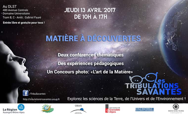 **** Concours photo ! Laissez dès à présent parler vos talents sur le sujet : “L’art de la Matière”. Envoyez vos photos avant le 12 Avril 2017 minuit, à l’adresse tribulations-savantes [at] univ-grenoble-alpes [point] fr avec vos nom et prénom. Les meilleures photographies seront exposées lors de l’évènement le 13 avril, et leurs auteurs recevront une petite surprise ! A vos appareils, nous attendons vos clichés !