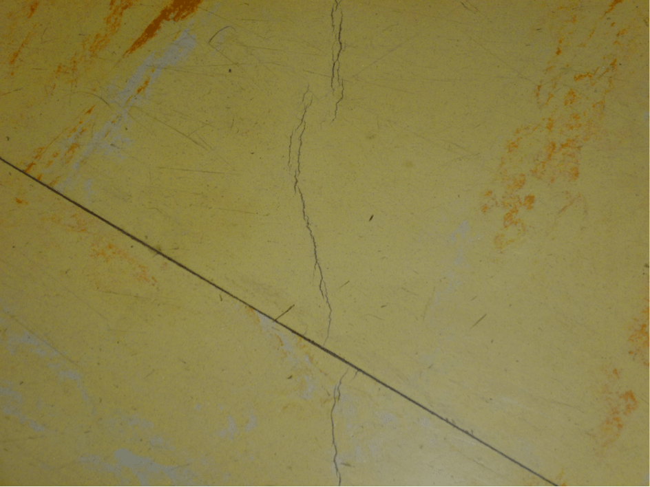 Cette petite faille dans le lino s’est formée dans une certaine continuité, malgré la présence de la rupture linéaire, qui, comme on peut l’observer subit néanmoins un décalage de 2,6 cm.