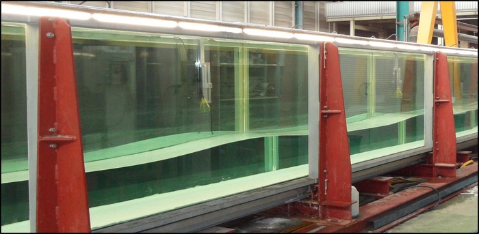 Le canal à houle du LEGI est un canal en verre mesurant 36 mètres de long, 1.3 mètre de profondeur et 0.55 mètre de largeur.