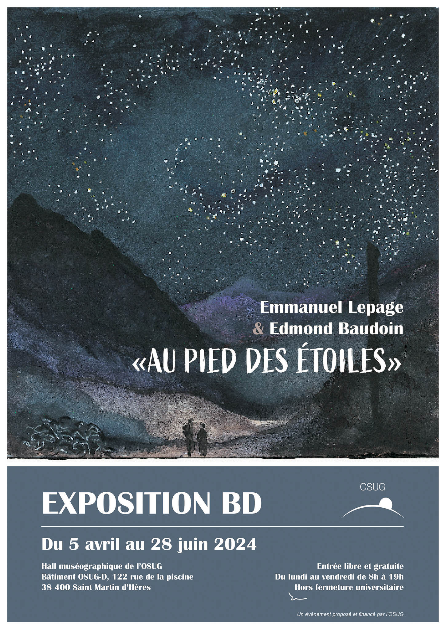 Une exposition sur les planches de la nouvelle BD d’Emmanuel Lepage et d’Edmond Baudoin "Au pied des étoiles" est présentée dans le hall muséographique de l’OSUG sur le campus universitaire du 5 avril au 28 juin 2024.