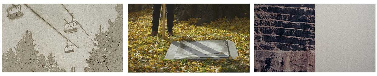 Pour chacun des pochoirs de STRATES, l’artiste plasticien Yves Monnier commence par réaliser une prise de vue d’un site choisi avec les chercheurs. Puis l’image est imprimée en négatif sur un autocollant fixé à une plaque de Fermacell. Commence alors un travail de découpe à la main, avec un scalpel ou une fraise. Ce pochoir est ensuite déposé directement sur le lieu de la prise de vue. Yves Monnier demande au paysage sa participation : pollens, particules, feuilles et sables se déposent. Après un mois, l’œuvre est révélée en retirant l’autocollant.