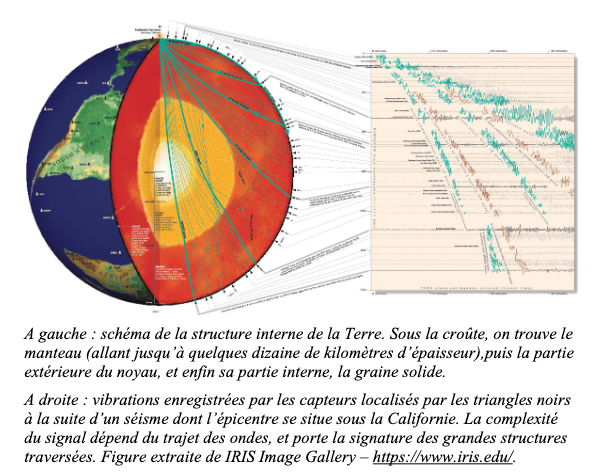 Pour « voir » et explorer l’intérieur de la Terre, une solution est d’utiliser des méthodes d’observation indirectes, reposant sur la propagation des ondes mécaniques, appelées ondes sismiques. Ces ondes se propagent dans les différentes couches et structures constituant la Terre, tout en accumulant une signature complexe du trajet parcouru. En enregistrant les vibrations du sol associées à ces ondes quand elles arrivent à la surface, les géophysiciens acquièrent les sismogrammes, données élémentaires de cette observation indirecte de la Terre. En combinant notre connaissance de la physique des ondes, et des équations mathématiques les modélisant, on peut chercher à reconstruire l’histoire de leur parcours, et la structure du sous-sol.
