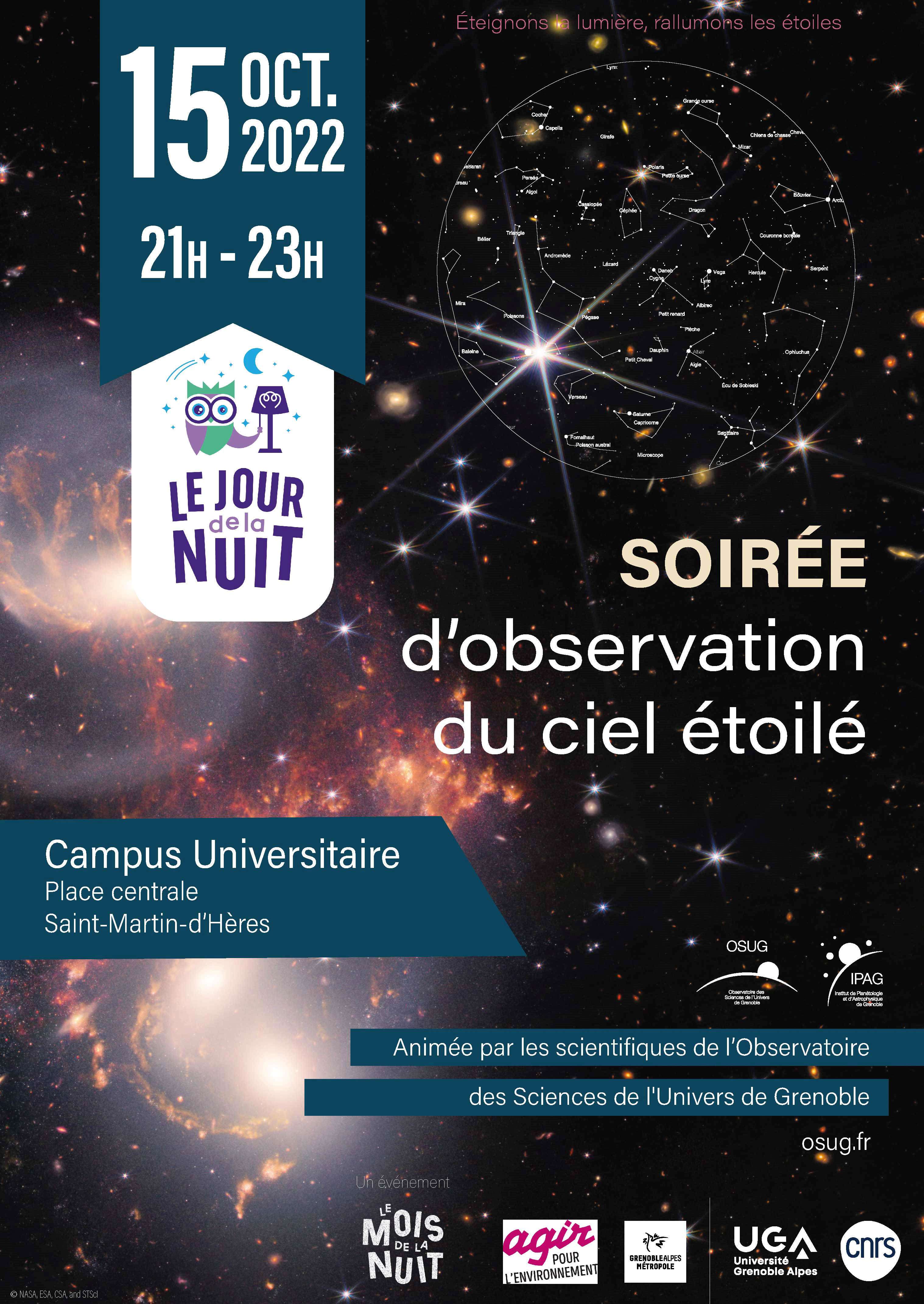 À l’occasion du Jour de la Nuit, l’opération nationale de sensibilisation à la pollution lumineuse, à la protection de la biodiversité nocturne et à la beauté du ciel étoilé, un regroupement de télescopes sera mis en place sur la place centrale du campus universitaire pour une soirée d’observation du ciel étoilé. Cette soirée sera animée par des scientifique de l’Observatoire des Sciences de l’Univers de Grenoble (OSUG / UGA, CNRS, IRD, INRAE, Météo-France). Rendez-vous au cœur du campus du Saint-Martin-d’Hères pour cette soirée d’observation gratuite et ouverte à tous !