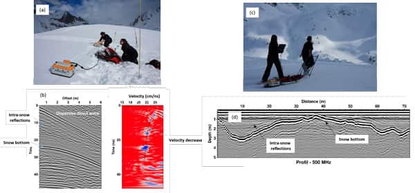 Exemple d’acquisition CMP avec les antennes 800 MHz (a) qui permettent d’obtenir un profil de vitesse de la neige (b) et exemple d’acquisition GPR obtenue avec une antenne 500 MHz blindée (a) et image convertie en profondeur (b)