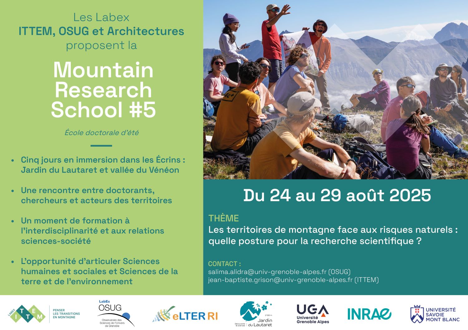 Proposée par les LabEx ITTEM, OSUG, UG@rchitecture, en partenariat avec la plateforme LTSER, la Mountain Research School (MRS) est un lieu de formation doctorale à l’interdisciplinarité entre Sciences humaines et sociales et Sciences de la Terre et de l’Environnement au sein des territoires de montagne.