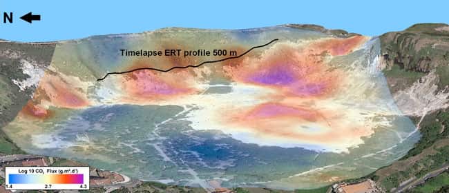 Le LabEx finance la réalisation d’une série temporelle de tomographies de résistivité électrique des systèmes hydrothermaux des volcans Champs Phlégréens et Merapi, l’un après l’autre, pendant plusieurs années. Couplé à des mesures permanentes à la surface de flux de gaz, de flux thermique par thermographie infrarouge, de sismicité, de déformations du sol et de potentiel électrique spontané, il a pour buts (i) de reconnaître la dynamique de ces systèmes, (ii) d’analyser de manière couplée les observations de surface et les modifications de la résistivité électrique jusqu’à une centaine de mètres, (iii) de modéliser les épisodes transitoires de dégazage volcanique avec le code de transport multiphasique non isotherme TOUGH2.