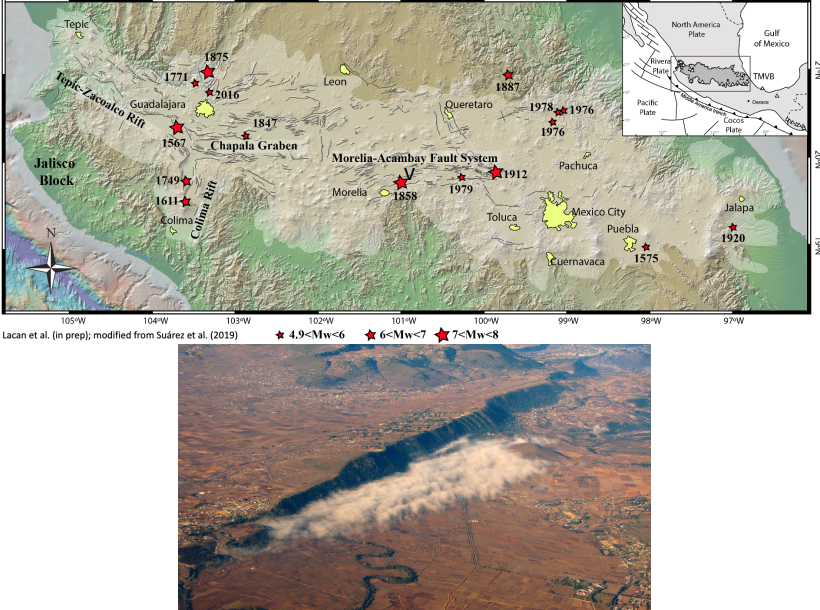 This internship proposes to adapt and use machine learning methods (deep learning) to characterize active faults in Mexico, of which a prototype is already developed at ISTerre. Central Mexico is segmented by a system of normal faults along the Trans-Mexican Volcanic Belt where more than potentially 600 active faults have been identified. This area is highly vulnerable to earthquakes since more than 60% of the Mexican population lives in megacities built along those faults (Mexico City : 23 million inhabitants, Guadalajara 5 million inhabitants, Queretaro 2 million inhabitants, Leon 1.5 million inhabitants, ...). This internship will address scientific issues such as 1) How can we extrapolate the knowledge of well-characterized faults to the whole fault system ? 2) Is it possible to detect spatial and temporal evolutions of fault activity ? 3) Can we discriminate when the segmentation took place ? During the same earthquake or during different earthquakes ? 4) What form of slip pattern follows the fault system (characteristic earthquake, ...) ?
