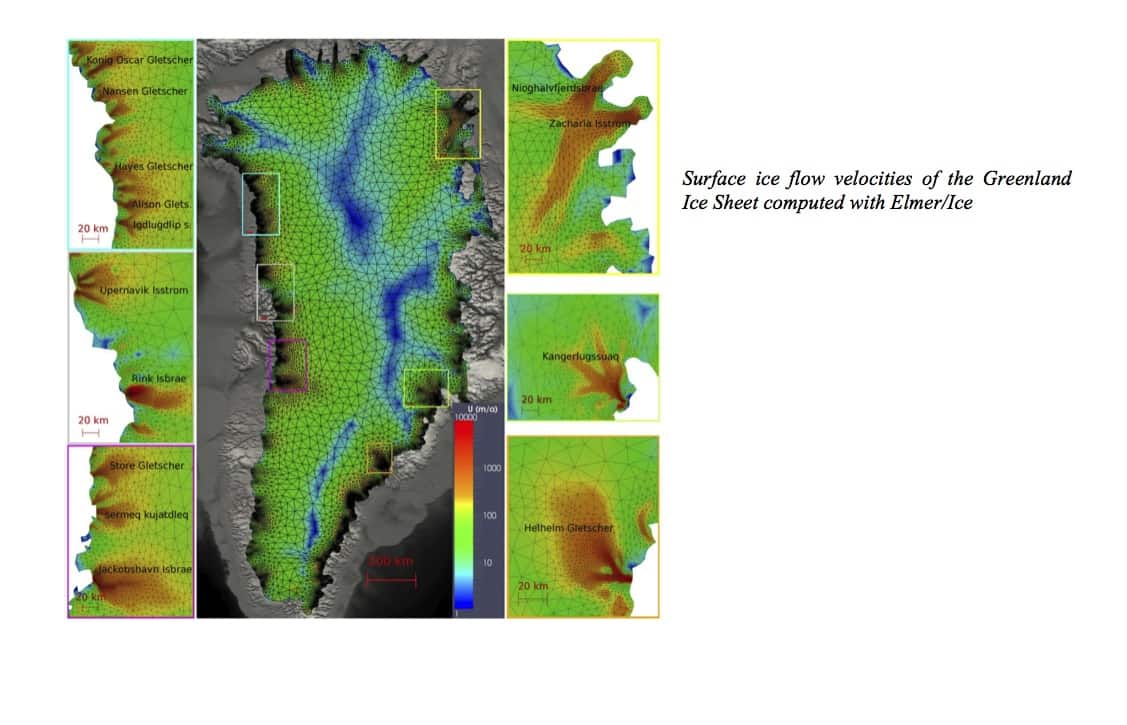 The ice flow modeling team, from the Laboratoire de Glaciologie et de Géophysique de l’Environnement is developing the ice-sheet model Elmer/Ice (http://elmerice.elmerfem.org). This open source code, with an increasing number of users, is today internationally recognized for the accuracy of the physical processes implemented in, the data assimilation methods developed and the quality of the computed projections. Elmer/Ice is currently used in various studies : (i) the investigation of physical processes involved in ice sheet dynamics (subglacial hydrology, damage and iceberg calving), (ii) projections of outlet glaciers evolution and (iii) interactions with the other components of the climate system (atmosphere, ocean) at the root of the observed changes in the ice flow dynamics.