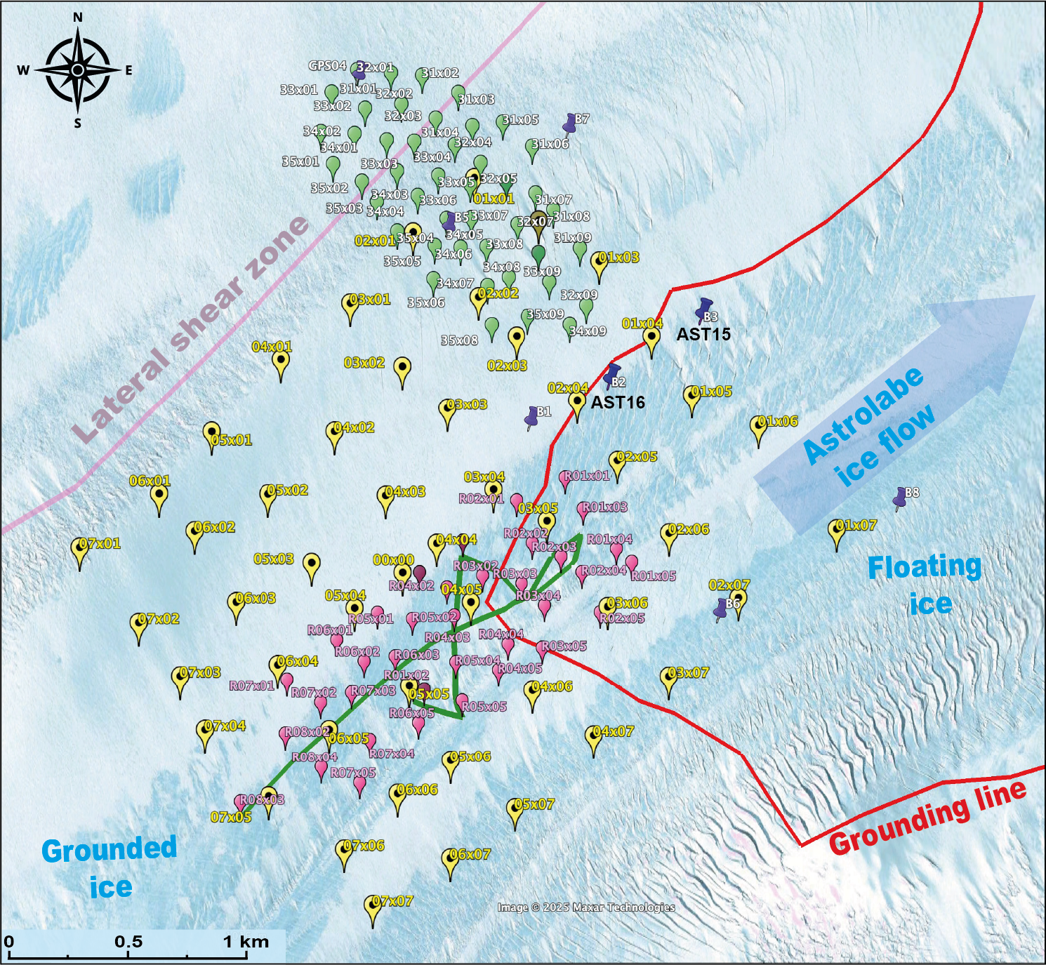 Les données sismiques à explorer et à analyser proviennent de 3 réseaux de nodes sismiques déployés ces dernières années sur le glacier de l’Astrolabe en Terre Adélie (Antarctique de l’Est), dans le cadre du projet SEIS-ADELICE (PI G. Barruol) : un premier réseau de 50 nodes, déployé en janvier-février 2023 sur la ligne d’échouage du glacier de l’Astrolabe ; un second réseau de 37 nodes associé à deux fibres optiques interrogées par DAS (Distributed Acoustic Sensing), déployé en janvier 2024 et un troisième réseau de 44 nodes sismiques déployés en janvier 2025 sur la shear-zone latérale ouest du glacier (voir carte de localisation).