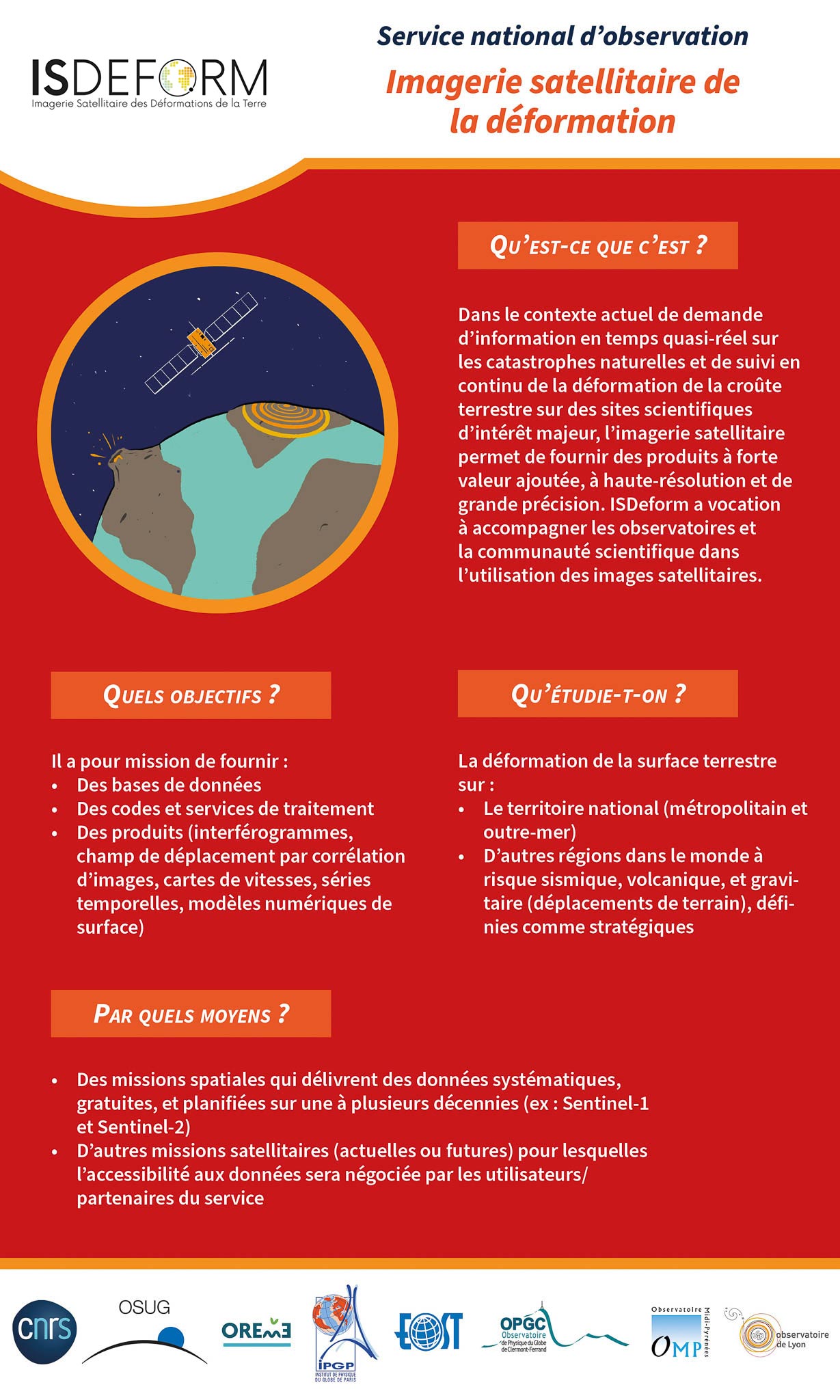 L’objectif du Service National d’Observation ISDeform (Imagerie Satellitaire des Déformation de la Terre) est de proposer un suivi des déformations de surface associées d’origine variées (e.g., surcharges, hydrologie, géothermie, …), en se focalisant en particulier sur les aléas telluriques (séismes, glissements de terrain, activité volcanique), en utilisant l’imagerie satellitaire optique et radar. ISDeform a pour vocation d’accompagner les observatoires, la communauté scientifique française et ses partenaires au Sud dans l’utilisation de ces données satellitaires. Sa principale mission est de fournir à la fois des bases de données/produits (interférogrammes, séries temporelles, modèle numérique de terrain) sur des cibles à fort intérêt scientifique ainsi que des services de traitement systématique ou à la demande avec l’aide du pôle FormaTerre de l’Infrastructure de recherche DataTerra. Le SNO développe aussi des interactions avec la communauté « surface continentale » (e.g., les SNOs Glacioclim et H+) afin de fournir des observations complémentaires ou des services adaptés.