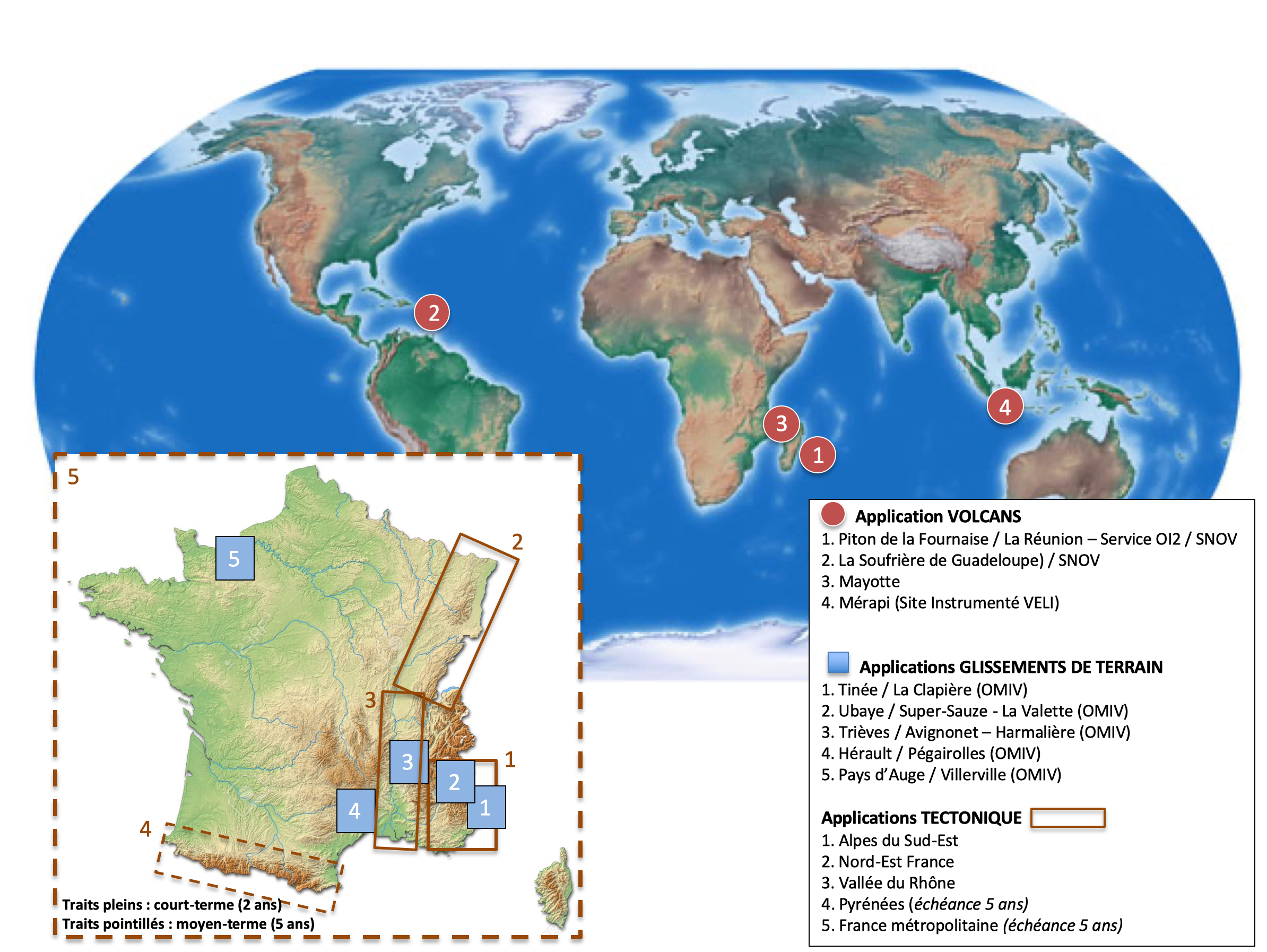 ISDeform traite les données satellitaires pour des cibles prioritaires associés aux thématiques : volcans, glissements de terrain et tectonique. Pour les volcans, les cibles sont les volcans actifs d’outre-mer surveillés dans le cadre du SNOV : Piton de la Fournaise, Soufrière de Guadeloupe, Mayotte ainsi que le volcan indonésien Merapi, site instrumenté VELI et considéré comme un analogue aux volcans antillais. Pour les glissements de terrain, les cibles prioritaires sont des sites instrumentés dans le cadre d’OMIV ainsi qu’un site au Pérou. Pour l’application tectonique, la priorité est mise sur les régions en France Métropolitaine associées à un fort aléa sismique.