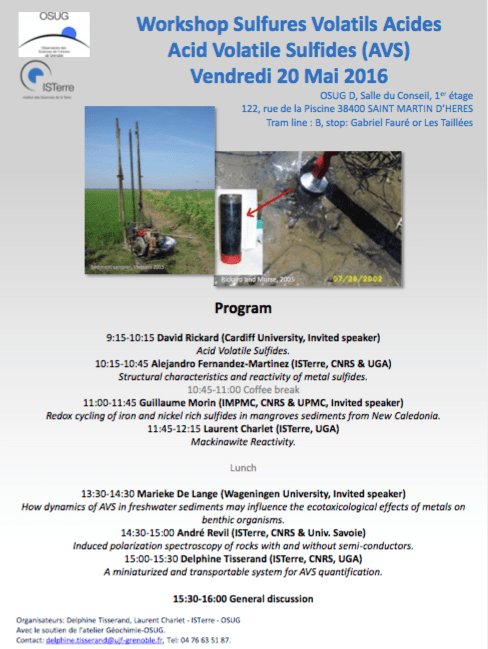 Pour poursuivre la première journée sur le soufre organisée par l’atelier Géochimie OSUG, une journée de workshop zoomée sur les espèces soufrées volatiles acides (les AVS), sulfures amorphes des environnements sédimentaires atoxiques, est proposée le 20 Mai.