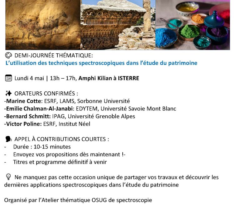 Organisé par l’Atelier thématique OSUG de spectroscopie, cette demi-journée sera l’occasion de partager vos travaux et découvrir les dernières applications spectroscopiques dans l’étude du patrimoine.