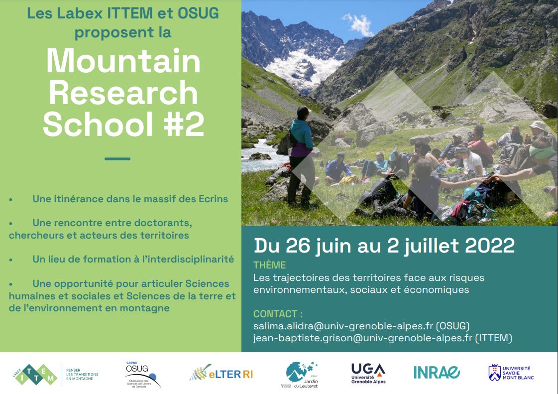 Les LabEx ITTEM et OSUG organisent pour la 2ème année consécutive la Mountain Research School qui se présente comme un lieu de formation doctorale à l’interdisciplinarité entre Sciences humaines et sociales (SHS) et Sciences de la Terre et de l’Environnement au sein des territoires de montagne.