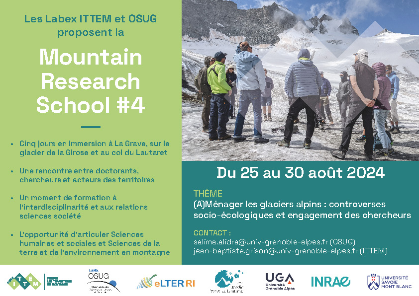 Proposée par les Labex ITTEM et OSUG, la Mountain Research School (MRS) est un lieu de formation doctorale à l’interdisciplinarité entre Sciences humaines et sociales et Sciences de la Terre et de l’Environnement en territoire de montagne.
