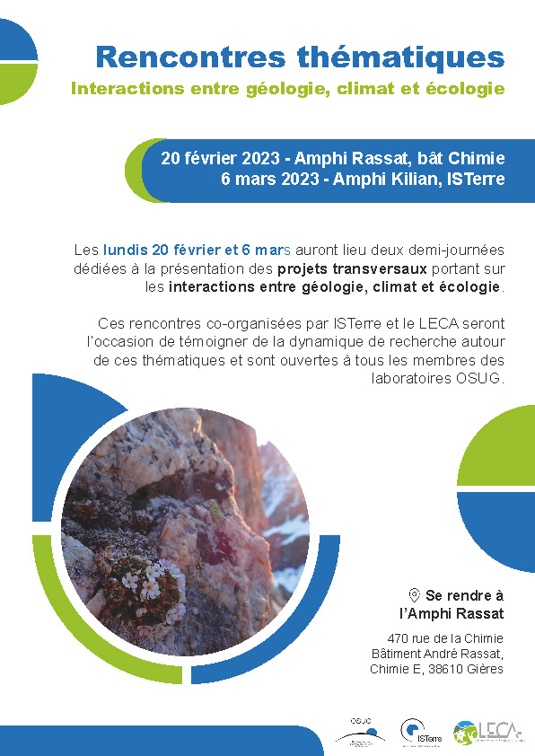 Les lundis 20 février et 6 mars auront lieu deux demi-journées dédiées à la présentation des projets transversaux portant sur les interactions entre géologie, climat et écologie. Ces rencontres co-organisées par ISTerre et le LECA seront l’occasion de témoigner de la dynamique de recherche autour de ces thématiques et sont ouvertes à tous les membres des laboratoires OSUG.